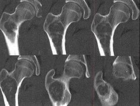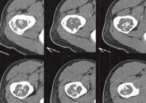 2)病变处于骨干中央时,骨皮质膨胀不明显;若处于一侧,则可使皮质变薄而明显膨胀。
