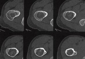 3.CT平扫示中心性类圆形低密度肿块,肿块周围见高密度硬化环,边界清晰,骨破坏区中央见斑点状、斑片状高密度钙化,骨旁肌间隙清晰,未见异常软组织肿块影。