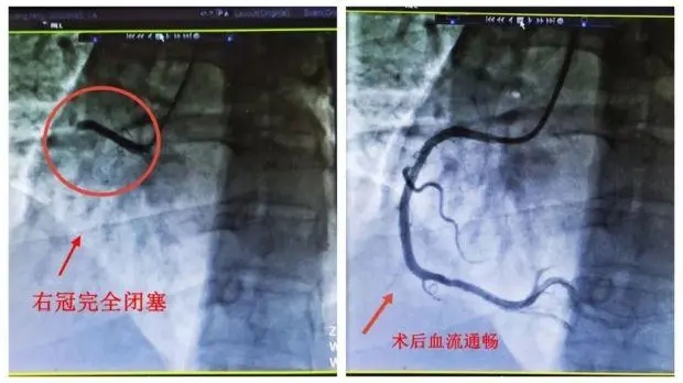 44岁的王先生“阳康”后没多久,突发胸闷胸痛2小时,被家属送到萧山中医院急诊科,诊断为急性ST段抬高型心肌梗死,右冠近段完全闭塞。
