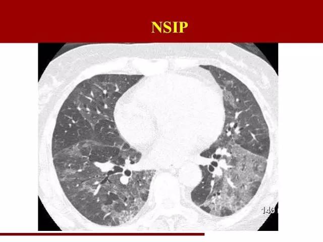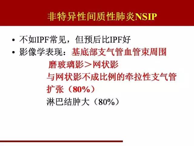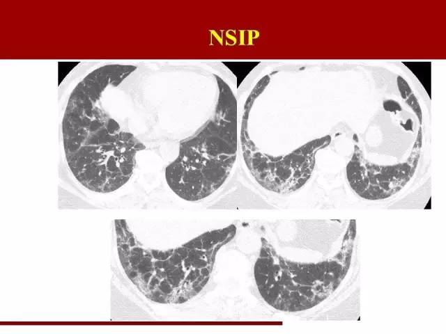 分布和UIP一致,不同的是磨玻璃阴影多于网格状阴影,可以伴有牵拉性支气管扩张