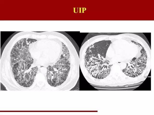双肺中下肺野胸膜下分布、网格状阴影多于磨玻璃阴影,终末期可以有蜂窝肺形成,伴有牵拉性支气管扩张