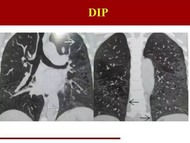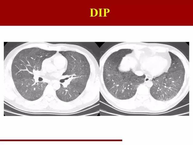 但是DIP的磨玻璃病变出现在肺泡腔,所以更有颗粒状感觉,也就是头皮屑的感觉
