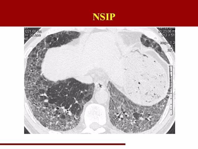 间质性肺炎的磨玻璃阴影:病理基础为小叶内间质增厚,即肺泡表面的间质发生炎症,覆盖部分肺泡,使肺泡密度增高,形成磨玻璃阴影。在NSIP中,这部分磨玻璃阴影代表着可逆部分,也就是说及时治疗有可能能恢复肺泡功能。因此影像科在报告的时候尽量能把磨玻璃阴影提出来,以便临床进行疾病严重程度评估。