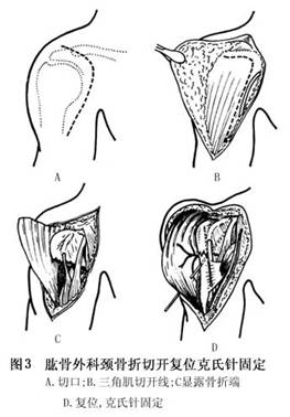 (2)手术方法:臂丛麻醉,取肩前外侧切口,在三角肌前缘分开部分肌纤维,并在离肩峰止点1cm处横断三角肌,显露骨折处,认清肱二头肌长头腱及两骨折端,撬拨断端复位,以克氏针交叉固定,缝合肌肉及皮肤(图3)。术后当天可起床,臂部固定2~4天后,三角巾悬吊患肢3周,去克氏针,逐渐练习活动。 医学百科网 | YxBaike.Com