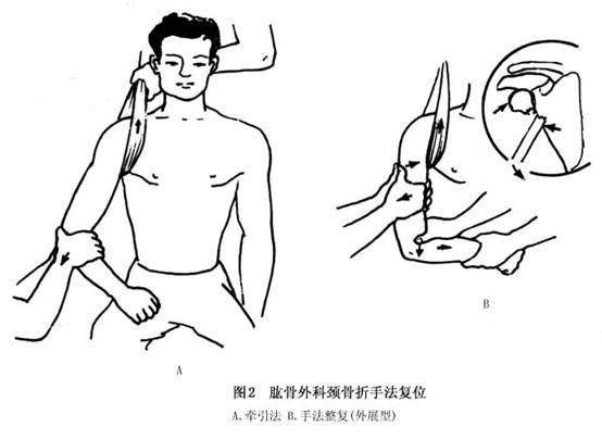 (2)外展型骨折:由于跌倒时上肢外展位所致,并使骨折远侧段呈外展,近侧段相应的内收,形成两骨折端向外成角移位,且常有两骨折端互相嵌插。