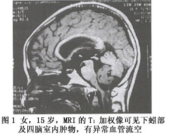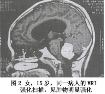 4.MRI 肿瘤T1像信号高于脑脊液为等T1;T2像为长T2信号,并可见肿瘤周围水肿带或小的血管流空影见图3,图4。此病应注意与小儿常见的后颅凹囊性星形细胞瘤鉴别。