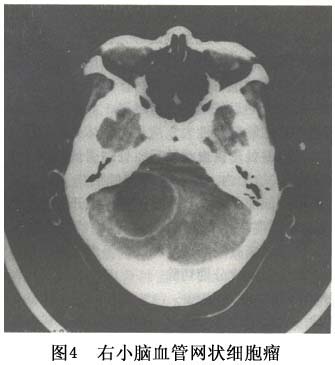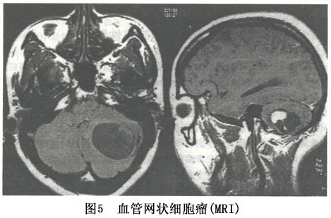 MRI可见血管网状细胞瘤T1像的信号强度高于脑脊液,T2像为长T2改变。瘤结节多为等T1长T2像。病灶轮廓显示上优于CT,T2像上见到肿瘤周围长T2的水肿带(图5)。
