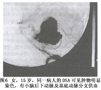 5.数字减影血管造影(DSA) MRI显示有明显血管流空效应的患儿应做此项检查,可显示血管团和供血动脉,必要时还可做供血动脉栓塞治疗(图6)。 医学百科网 | YxBaike.Com