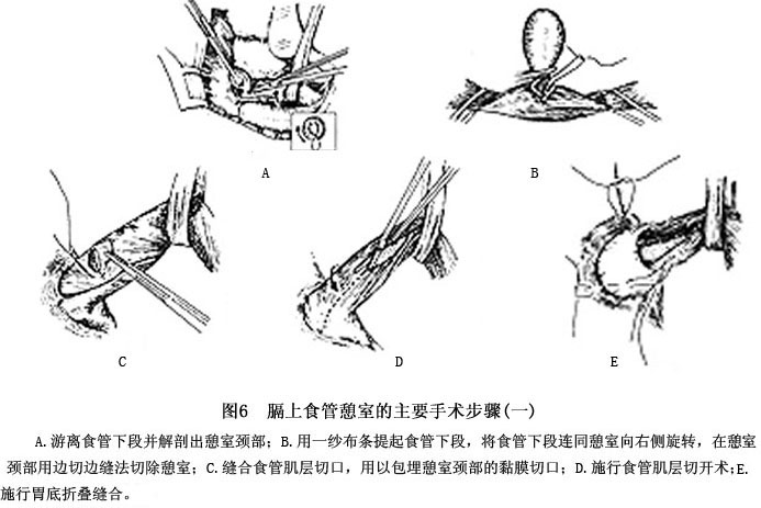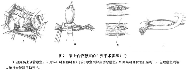 2.手术治疗 仅适用于症状呈进行性发展且严重的病例。如果因合并食管或膈肌的其他疾病而需要手术时,则应同时切除其膈上憩室。