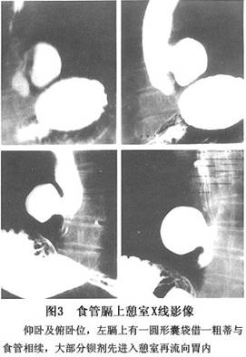 1.胸部X线片:①平片中大的憩室可见液平面。②食管钡餐造影:餐造影检查不仅可以显示膈上食管憩的具体部位、大小、憩室囊、憩室颈部及其方向、憩室的外形、食管腔的最大扩张度 以及局部食管壁缺损的长度,还可明确有无与膈上食管憩室有关的其他疾病,如食管神经肌肉功能紊乱、食管裂孔疝、贲门失弛缓症、食管狭窄或憩室癌,其中膈上食管憩室合并食管裂孔疝的病例最为常见。影像表现为:多发生在膈面上方5~6cm处,以食管右侧多见(图1),食管一侧壁类圆形突出,口部可窄小或宽大(图2),边缘光滑,大小随食管的收缩舒张而变化。钡剂容易贮留而不易排出,故憩室体积较大(图3),其内常因有食物残渣而密度不均,易发生感染,甚至坏死穿孔。