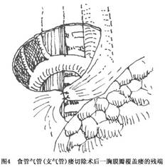 ②切断下肺韧带,将肺向前上方牵拉。沿食管床剪开食管下段的纵隔胸膜,仔细游离食管下段及憩室,并用一细纱布条或橡皮条将食管轻轻提起。这时,要确认和保护迷走神经。为充分显露和切除憩室,可将食管下段连同憩室一并向右侧旋转(图4)。