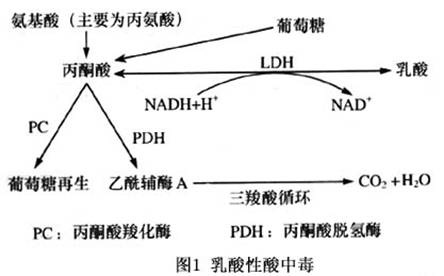 (1)乳酸性酸中毒:乳酸性酸中毒是代谢性酸中毒的常见原因。正常乳酸是由丙酮酸在乳酸脱氢酶(LDH)的作用下,经NADH加氢转化而成,NADH则转变为NAD 。乳酸也能在LDH作用下当NAD 转化为NADH时转变为丙酮酸。因此决定上述反应方向的主要为丙酮酸和乳酸两者作为反应底物的浓度以及NADH和NAD 的比例情况。正常葡萄糖酵解时可以产生NADH,但是生成的NADH可以到线粒体而生成NAD ,另外丙酮酸在丙酮酸脱氢酶(PDH)作用下转化成乙酰辅酶A,后者再通过三羧酸循环转化为CO2及H2O(图1)。 医学百科网 | YxBaike.Com