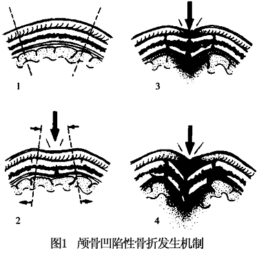 1.颅骨局部变形 颅盖(穹窿部)遭受外力打击时,着力部分即发生局部凹曲变形,而外力作用终止时,颅骨随即弹回原位。若暴力速度快、作用面积小,超过颅骨弹性限度时,着力的中心区即向颅腔内呈锥形陷入,内板受到较大的牵张力而破裂。此时如果暴力未继续作用于颅骨上,外板可以弹回而复位,故可以保持完整,造成所谓单纯的内板骨折,是为后期外伤性头疼,或慢性头疼的原因之一。如果暴力继续作用,则外板亦将随之折裂,造成以打击点为中心的凹陷及其外周的环状与线形骨折。若致伤暴力的作用仍未耗尽或属高速强力之打击,则骨折片亦被陷入颅腔内,而形成粉碎凹陷性骨折或洞形骨折(图1)。