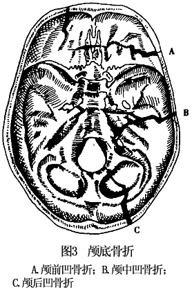 颅底骨折依其发生部位不同,分为颅前窝骨折,颅中窝骨折和颅后窝骨折,临床表现各有特征,兹分述如下(图3)。 医学百科网 | YxBaike.Com
