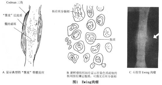 1.X线诊断 尤因肉瘤无论在临床还是在X线片诊断上,早期均比较困难,有时即使是活体组织检查,由于取材未包括瘤细胞巢,确诊亦很困难,需要电镜及免疫组织化学和分子学方法才能确诊,因此,需要将临床、影像学、病理三者结合综合分析。局部疼痛剧烈,肿胀发展快,全身情况恶化迅速,经抗感染治疗无效,或开始时有效,很快又变为无效时,应考虑诊断本病。在X线片上:长骨的干骺端受累,其位置较骨肉瘤更近骨干,瘤区出现反应性新生骨,典型“葱皮样”骨膜增生者,诊断较容易,但多数病例并非呈典型表现,而主要表现为骨破坏,扁骨有溶骨、硬化或混合型破坏,无明显特殊表现,但其他恶性肿瘤骨破坏常有其特殊征象。短期内重复摄片比较有助于诊断。CT和MRI对病骨周围软组织肿胀及肿块界限比X线要优越的多,且MRI又比CT更敏感,并能显示骨髓状况。在组织学上,取材要充分足够,应包括软组织、骨膜、骨质及瘤骨。镜下可见小圆形均匀一致的瘤细胞,组织化学检查多数瘤细胞含糖原(90%以上)。 医学百科网 | YxBaike.Com