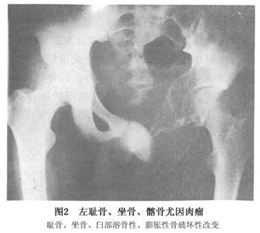 发生于扁骨的尤因肉瘤的X线表现可呈现出溶骨型、硬化型及混合型骨破坏三类。有的甚至出现膨胀性改变(图2)。有的亦可出现放射状针状骨。有作者(1986)认为:针状新生骨则为尤因肉瘤比较独特的表现,出现率不低,原发于骨盆的肿瘤其出现率就更高。位于椎体的病变,表现为椎体广泛骨质破坏,邻椎可受累,多无骨膜反应,椎旁可见软组织阴影。