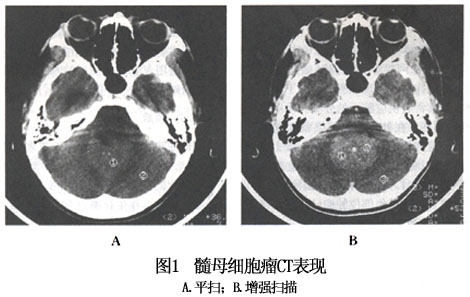 典型髓母细胞瘤一般直径大于3.5cm,位于后颅凹中线之小脑蚓部。累及上蚓部的肿瘤延伸到小脑幕切迹之上,在头颅CT上87%呈现为均匀一致的高密度影(图1),10%为等密度病灶,病灶中有小坏死时,平扫亦可呈不均匀之混杂密度,少数有钙化,偶可呈低密度囊性变。病灶边界均较清晰,多位于小脑蚓部,成人患者可多见于小脑半球。增强检查呈均匀一致的强化。有时病灶周围环绕有一条薄的低密度水肿带。第四脑室常被推移向前,可伴有梗阻性脑积水征。当出现脑室室管膜下转移时,可在脑室周边出现完全或不完全略高密度影像,成带状,可有明显强化。与室管膜瘤的鉴别主要是髓母细胞瘤的钙化及囊性变少见,病灶密度比较均匀。 医学百科网 | YxBaike.Com