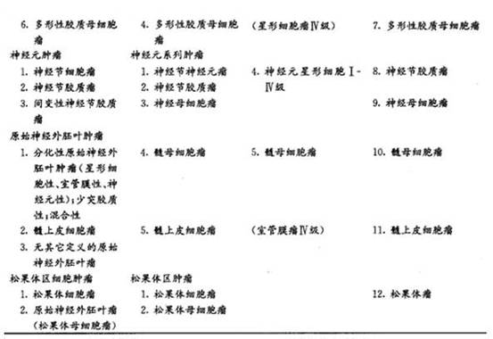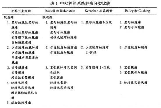 3.分类 中枢神经系统颅内肿瘤分类方法很多,比较具有代表性的主要有以下几种,见表1。Bailey和Cushing的分类能反映肿瘤组织的来源及恶性程度,长期以来被世界多数地区的神经外科和病理科所采用。在此基础上衍生出一些新的分类方法,如Kernohan的Ⅰ-Ⅳ级分类法,Russell的胶质瘤分类。较有影响的是Kernohan提出将胶质瘤,包括星形细胞瘤、少突胶质细胞瘤、室管膜瘤和神经源肿瘤等,按其分化程度分为Ⅰ-Ⅳ级,根据这个分类似乎能够容易地判断肿瘤的发展和病人的预后,因此受到临床医师欢迎,在国内国际上使用多年。但此分类法也有缺陷,如同一肿瘤在不同部位,细胞分化即可不同,有些混合瘤无法分级,而有些肿瘤分级意义不大。在此基础上世界卫生组织制定了新的分类法,其特点是分类细致,包括了颅内发生的各种肿瘤类型,吸收了既往各种分类的特点和长处,既反应了肿瘤的形态学,又表明肿瘤的来源,并采用间变这一概念,可认为是目前最好的分类。 医学百科网 | YxBaike.Com