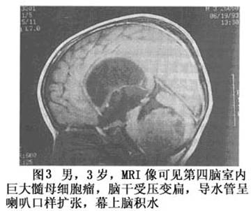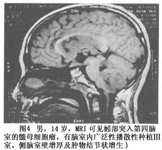 学龄前或学龄期儿童,尤其是男孩,出现不明原因的头痛、呕吐,继而步态不稳、眼球震颤、复视,首先应考虑髓母细胞瘤的可能,应进一步行神经放射检查来明确诊断。部分患儿在脑脊液中找到脱落瘤细胞更可确诊。髓母细胞瘤易播散转移,如果后颅凹肿瘤有脑室内播散则术前可以确诊本病(图4)。 医学百科网 | YxBaike.Com