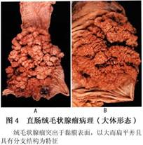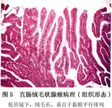 (2)绒毛状腺瘤:又称乳头状腺瘤,呈绒毛状、菜花状突出于黏膜表面,病变范围限于黏膜层,瘤体质地柔软,广基无蒂,体积较管状腺瘤大(图4),镜下绒毛状突起呈分支状,形成一个细长乳头状花冠肿物(图5)。多见于老年人,男性多于女性,约90%发生在直肠和乙状结肠下段,易癌变。