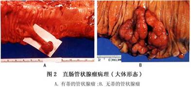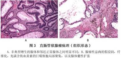 (1)管状腺瘤:最为常见,多数是单个,有蒂,直径一般在1cm以下,在肠黏膜表面隆起如米粒或黄豆大,表面光滑或呈细颗粒,颜色接近正常黏膜,质软;大腺瘤如樱桃或草莓,表面有浅沟或分叶状,色暗红(图2),很少癌变。镜下形态可有不同程度改变,轻者为轻度腺体增多,上皮细胞无异常,重者不仅腺体明显增生,上皮细胞的形态及染色也呈不典型改变,核分裂增多(图2),进一步发展出现腺体细胞多形性,间质浸润(图3),即被认为是重度不典型增生或癌变。