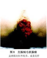 小息肉很少引起症状,息肉增大后最常见的症状为直肠内出血,多发生在排便后,为鲜红血液,不与粪便相混。多为间歇性出血,且出血量较少,很少引起贫血。直肠下端的息肉可在排便时脱出肛门外,呈鲜红色,樱桃状,便后自行缩回。直肠息肉并发感染时,可出现黏液脓血便,大便频繁,里急后重。有排便不尽感(图8)。炎性息肉主要表现原发疾病症状。 医学百科网 | YxBaike.Com
