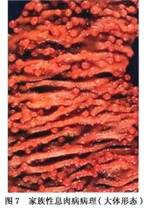 (5)家族性腺瘤性息肉病:是一种常染色体显形遗传性疾病,大肠内布满息肉状腺瘤,大小不等,可有蒂或无蒂(图7),具有很高的癌变倾向,多在12岁以后发生。 医学百科网 | YxBaike.Com