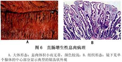 (4)炎性息肉(假性息肉):发生在大肠炎性疾病的再生与修复阶段,多见于溃疡性结肠炎、Crohn病、肠结核、血吸虫病等。常为多发,无蒂、体积较小,直径很少超过5mm,是其特征(图6A),颜色多较浅。有的亦可以有蒂,病程较长时可增大至几厘米。镜下见腺体变长伴有腺腔内反折,形成锯齿样外观(图6B)。核分裂活性增加仅仅见于基底部,上皮细胞具有不明显的位于基底的细胞核、胞浆丰富,充满黏液。表面上皮下的基底膜增厚,表面上皮呈微乳头外观。增生性息肉(化生性息肉),多发生在直肠,多在40岁以后发病,随年龄增长,发病率增加。 医学百科网 | YxBaike.Com