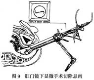 3.肛门镜下显微手术切除 适用于直肠上段的腺瘤和早期直肠癌的局部切除术(图9)。麻醉后,经肛插入显微手术用肛门镜,通过电视屏幕,放大手术野,镜下切除息肉。与电灼切除相比较,优点是切除后创面可以缝合,避免了术后出血、穿孔等并发症。