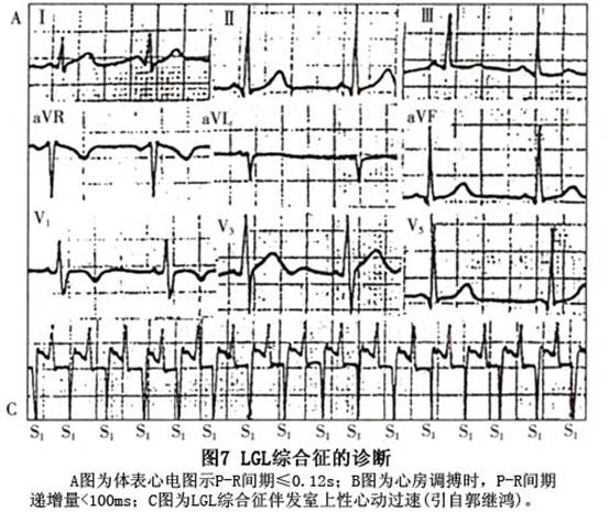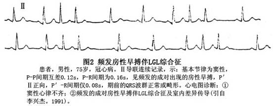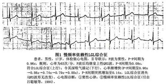 Lown、Ganong、Levine于1952年报道了一种呈现短的P-R间期(<0.12s)和无δ波的正常QRS图形心电图表现。可伴有阵发性室上性心动过速或心房扑动、心房颤动伴以快速的心室率,故称为短PR综合征,亦称James束型预激综合征或LGL综合征。
