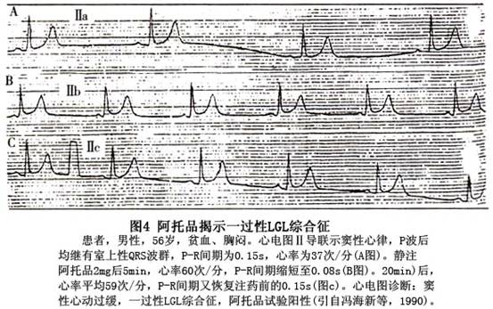 ①隐匿性短P-R综合征:有人认为约50%的短P-R综合征患者平时呈隐匿状态,仅在某些情况下一时性出现,例如房性期前收缩的刺激、阿托品试验等(图2,3,4)。其产生机制可能是:A.James束存在着4相阻滞,因此提前出现的房性激动可能经此提前下传心室。而相对延迟出现的窦性激动则不能通过James束下传,而仅能经正常途径下传;B.James束某处有前向阻滞区,但房性节律点却位于该阻滞水平以下,因此其激动可沿James束下传,而位于阻滞水平以上的窦性激动则在经James束下传时受阻。又如阿托品对房室和旁路的迷走神经影响并非平行,它对旁路的影响大于对房室结的影响,致旁路的有效不应期一度短于房室结的有效不应期,窦性激动便优先通过旁路下传,使隐性短P-R综合征显性化。随着阿托品影响消失,两者又恢复了各自固有的有效不应期,短P-R综合征便从显性又变为隐匿性。 医学百科网 | YxBaike.Com