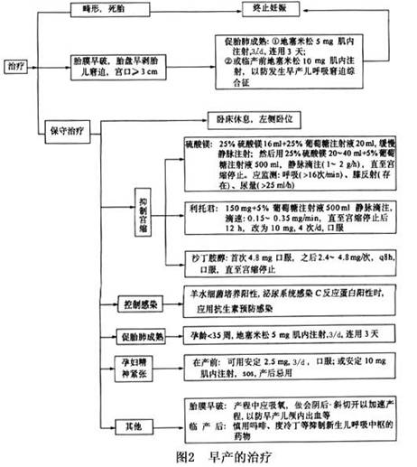 治疗原则:若胎儿存活,无胎儿窘迫,胎膜未破,应设法抑制宫缩,尽可能使妊娠继续维持;若胎膜已破,早产已不可避免时,尽力设法提高早产儿的存活率(图2)。 医学百科网 | YxBaike.Com