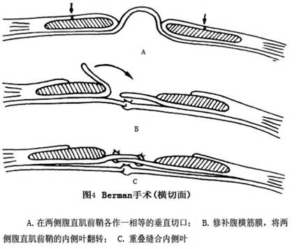 3.白线孔隙的修补 修补孔隙时,采用横行缝合白线为宜,以防止由于肌肉侧方牵拉而撕裂。孔隙小者,用丝线间断缝合即可;孔隙大者,则需重叠缝合,将孔隙分上下两叶,彼此重叠1~2cm,用丝线间断褥式缝合;如白线有多处缺损,可采用Berman手术,即在缝补腹横筋膜后于两侧腹直肌前鞘各作一相等的垂直切口,将两侧前鞘的内叶重叠缝合以修补薄弱或有缺损的白线(图4)。