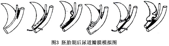 后尿道瓣膜症的病因不清楚,因偶有家族史,有人认为是中肾管的发育异常,也可能是多因素的结果,也有人认为是尿生殖窦发育异常造成的(图3)。 医学百科网 | YxBaike.Com