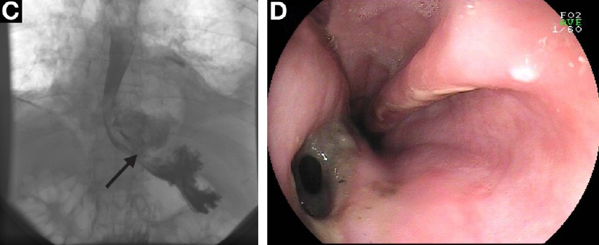 泛影葡胺吞咽检查(图C)显示,食管远端破裂,泛影葡胺漏至纵隔(长箭头)。上消化道内镜检查证实食管远端左后外侧壁破裂,符合Boerhaave综合征(图D),并置入1枚自膨胀覆膜支架。开始给予广谱抗生素治疗和鼻胃管饲养,行管状胸廓造口术对左侧胸膜积液引流。不幸的是,尽管初期病情有所改善,但该患者随后病情恶化,在入院后30天时死亡。