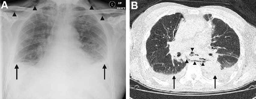 一名年龄84岁的老年男性因急性左侧胸痛、近期腹泻呕吐而来到急诊室。他患有严重阿尔茨海默病性痴呆,住在长期护理机构。在到达急诊室时,该患者无法清晰表述病史,并且因胸痛而非常痛苦。检查显示,锁骨上皮下气肿,肺底进气量减少。实验室检查显示,白细胞增多(29.7×103/L)、急性肾衰竭(血尿素氮59.5 mg/dl,肌酐2.2 mg/dl)。胸部X线片(图A)证实皮下气肿(三角箭头),并且提示双侧胸膜积液(长箭头)。胸部CT(图B)显示纵隔气肿(三角箭头)和双侧胸膜积液,左侧积液更多(长箭头)。