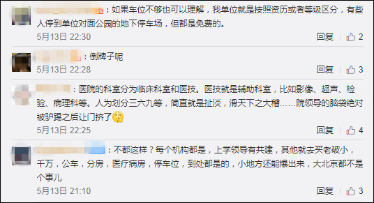 不过对于此事,也有一部分网友持反对态度,认为凭职称停车的规定,满满的官僚主义。大家都是在一所医院上班,虽然职级上、收入上有所差异,但是员工之间最起码的平等权利应该是匹配的,比如就餐、社会保障、福利待遇,当然也包括停车。