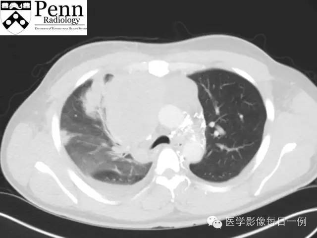 A.患者血小板计数> 50000,INR < 1.5,无抗凝治疗 B.常需全麻 C.局部标准CT检查或CT透视可用于穿刺引导 D.如果怀疑为淋巴瘤,需细针抽吸活检、组织芯活检并流式细胞技术 E.所有以上除外B 10.睾丸超声示 A.无异常 B.睾丸微石症,无局限肿块 【答案】1.B注释:右肺中叶肺不张,但并非为肺炎2.A3. B 4.D 5. E注释: 小细胞癌和恶性胸腺瘤多见于50-70岁患者6.B 7.B 8.E 9.E 10.B 【患者病程】患者分别行2次CT引导下经胸廓前纵隔肿块穿刺活检,但未确诊。经纵膈镜最后诊断为纵膈精原细胞瘤,但睾丸内未见原发病变。对上腔静脉综合征行支持治疗,而后化疗。 【影像学表现】 胸片:右肺上叶肿块样实变并纵膈肿块、肺门及纵膈淋巴结肿大,亦见肺底积液。 CT: 医学百科网 | YxBaike.Com